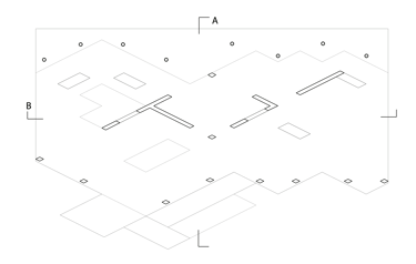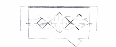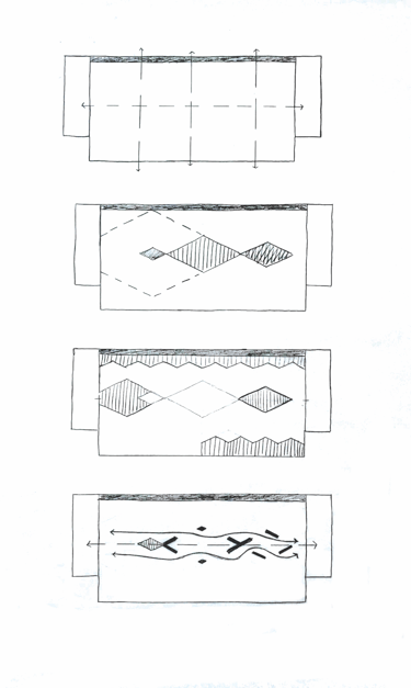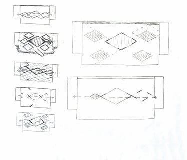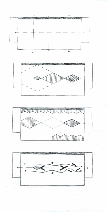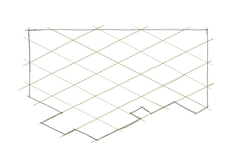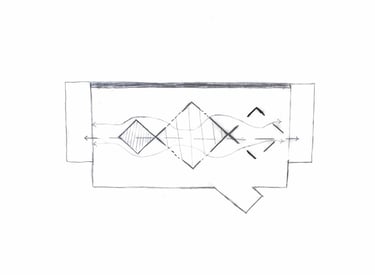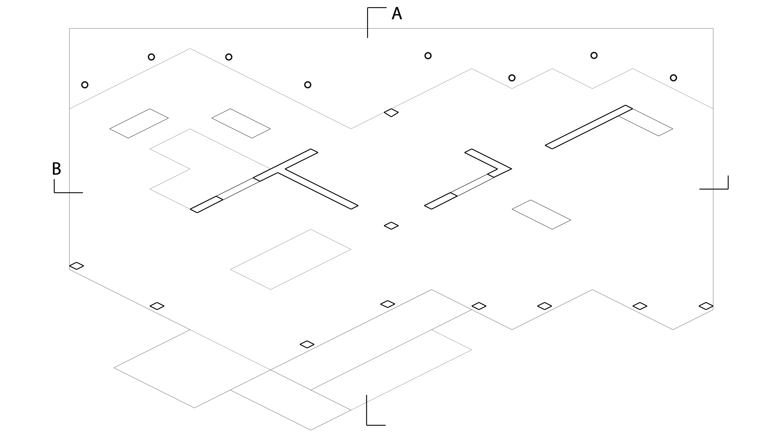 The design is defined by a disrupted center axis, with elements surrounding it following a strict diagrid. Architectural features, such as walls and an overhead plane, align with the central axis of the diagrid, while the landscaping, waterfront edge, and pier establish the perimeter, integrating the space with its surroundings.