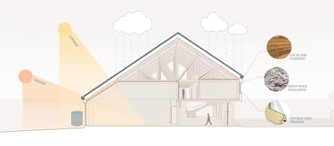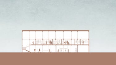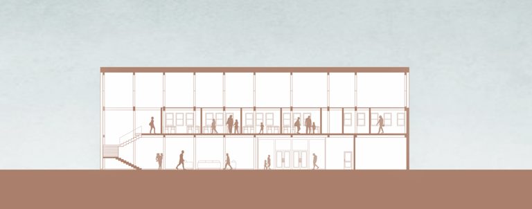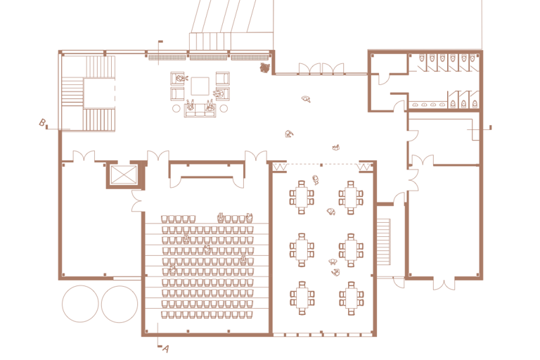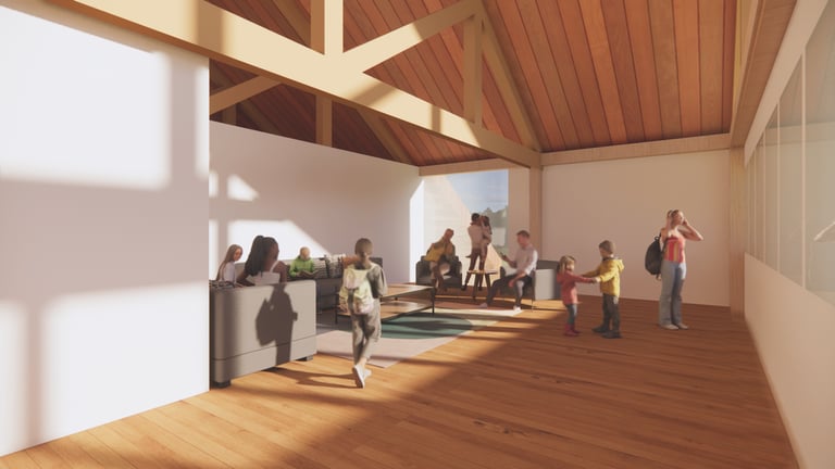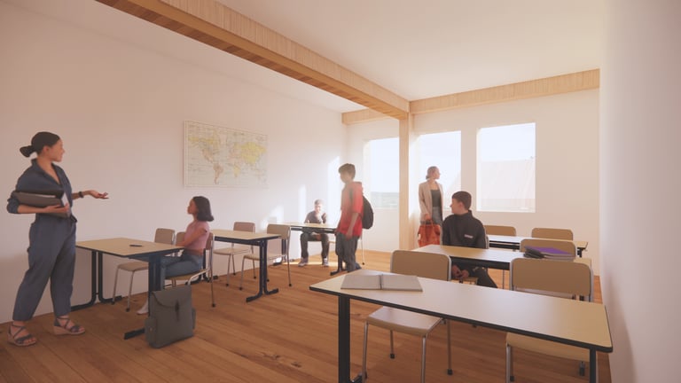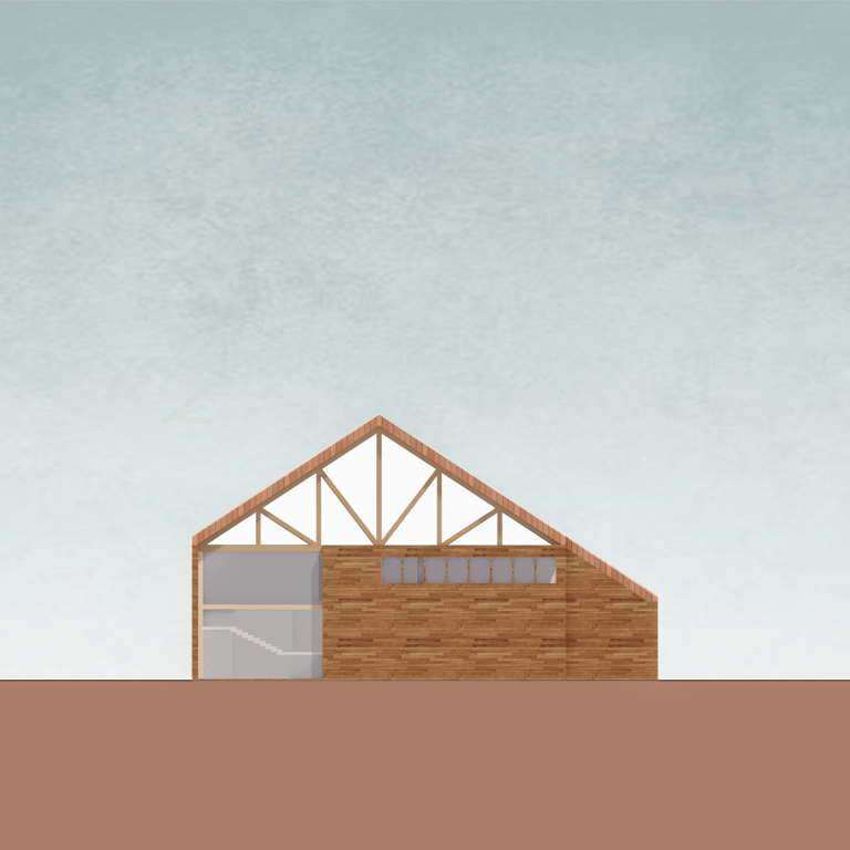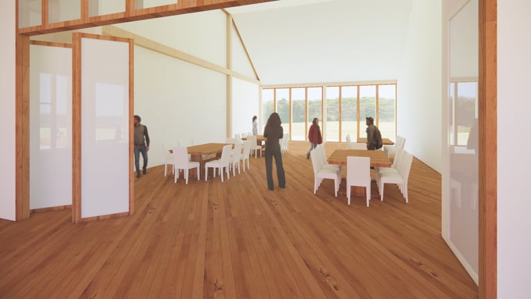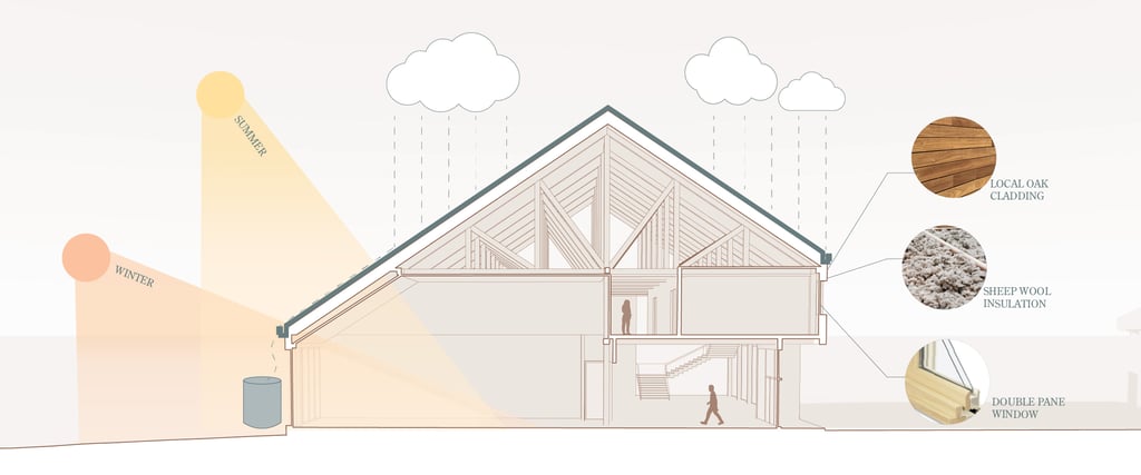 Sustainability played a key role in the design of the Learning Barn, seamlessly integrating environmental responsibility with functional architecture. The slope of the roof not only reflects the traditional farmhouse typology, but also serves the functional purpose of collecting rainwater for toilet flushing, and irrigating the surrounding cultivated fields and gardens.