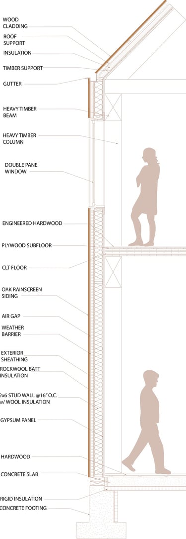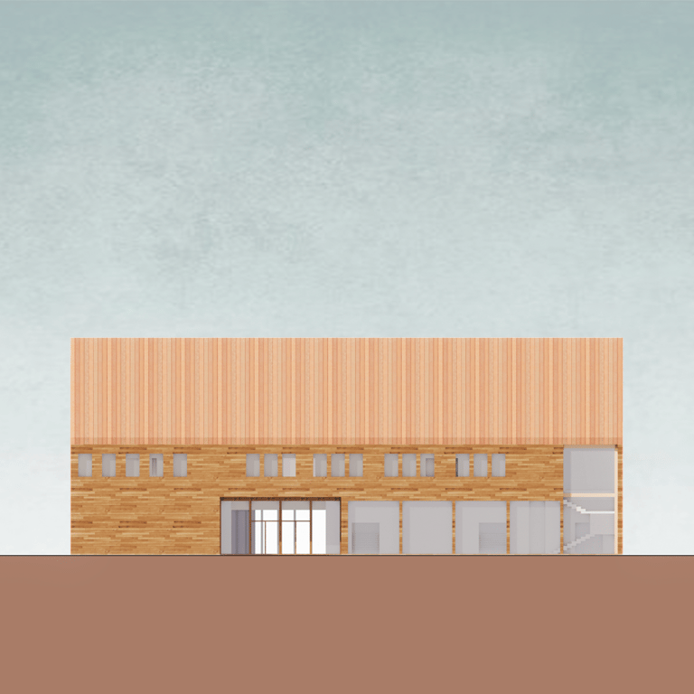 Thoughtful material selection further reinforces the project’s eco-conscious approach. The exterior is clad in oak wood from trees native to the area, and natural sheep wool insulation was chosen for its renewable qualities and excellent thermal performance. In addition, double-pane windows offer improved energy efficiency, and better noise reduction for the building.